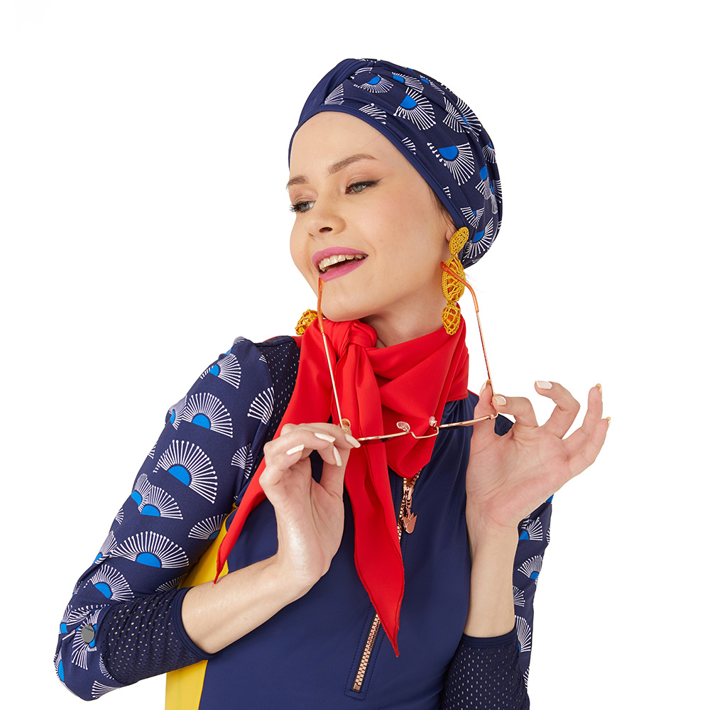 Our new Luna is a swim balaklava extrodinaire! Versatile & lightweight! Tie it around your neck for sun protection or extra coverage, or as headband or as mini wrap around your waist…the options are endless…. style it your way!