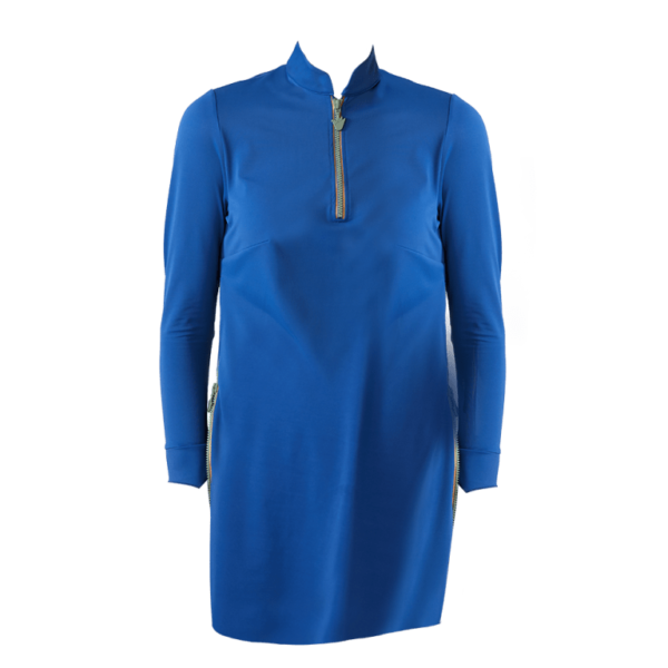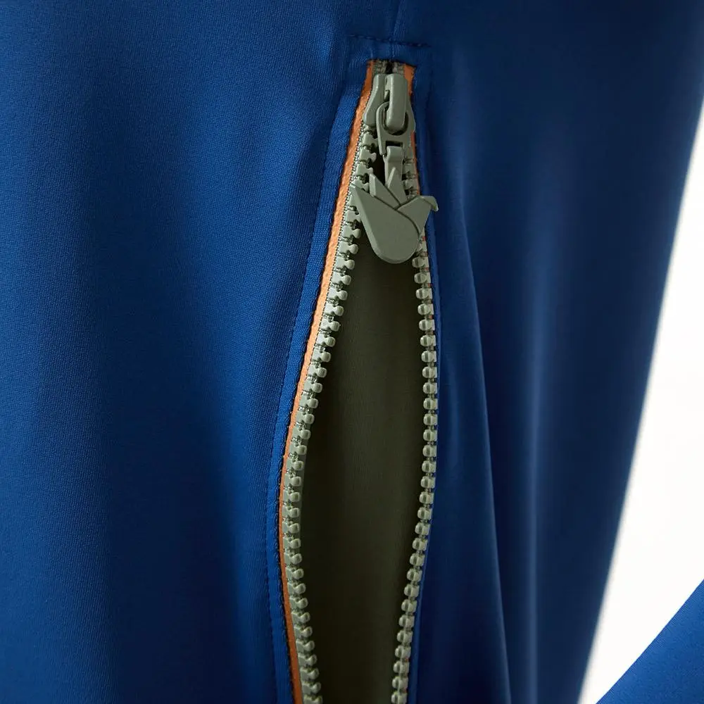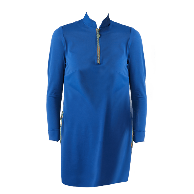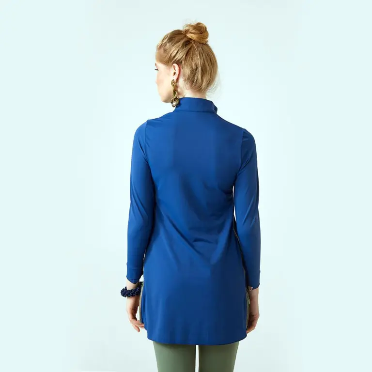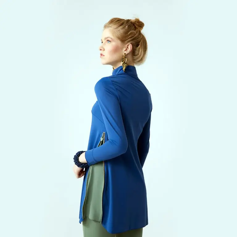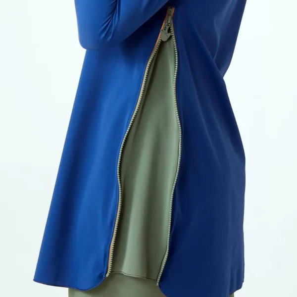 Matira in Lapia & Olive is a swim top that can be zipped up for a looser fit or zipped down for a tighter sportier look on either side.