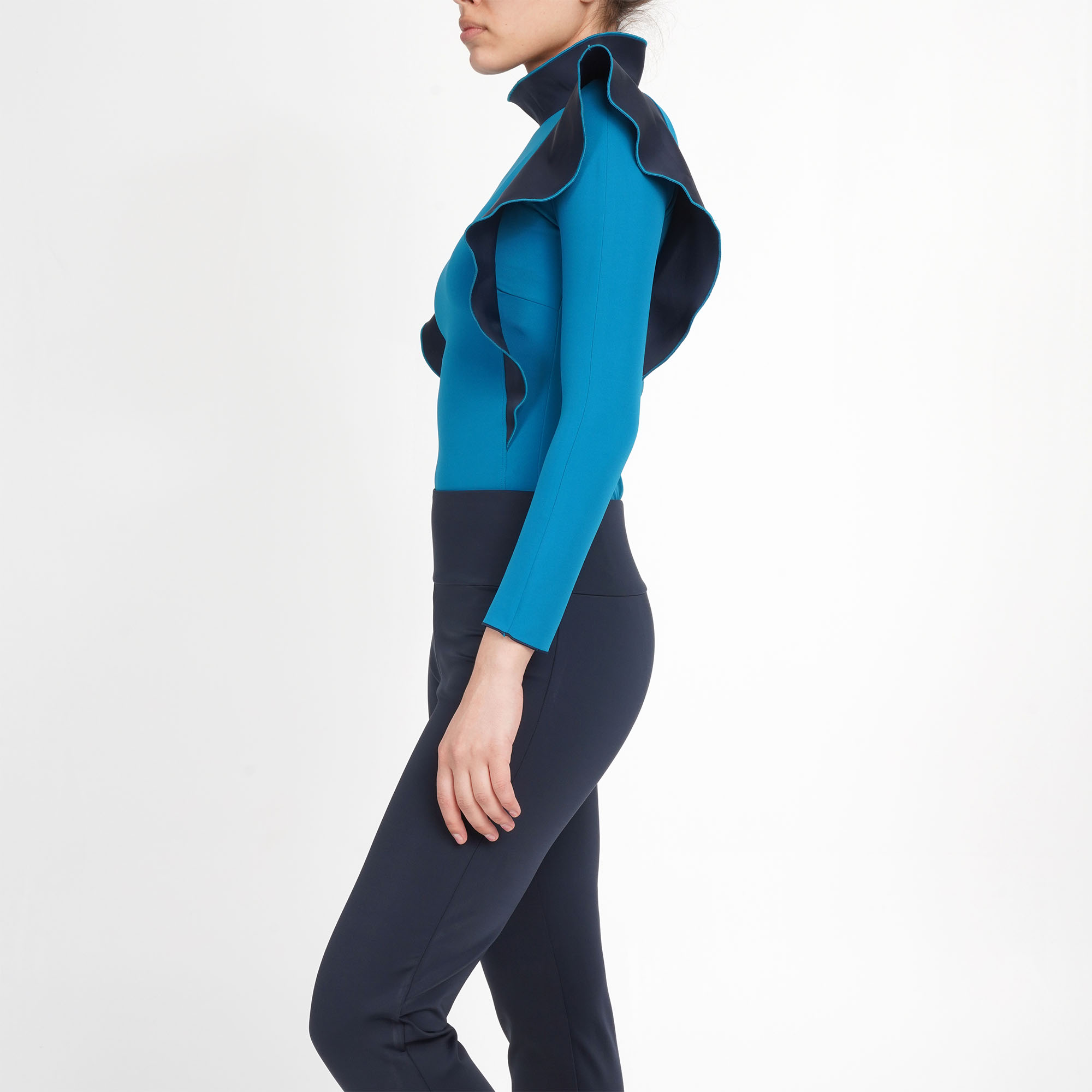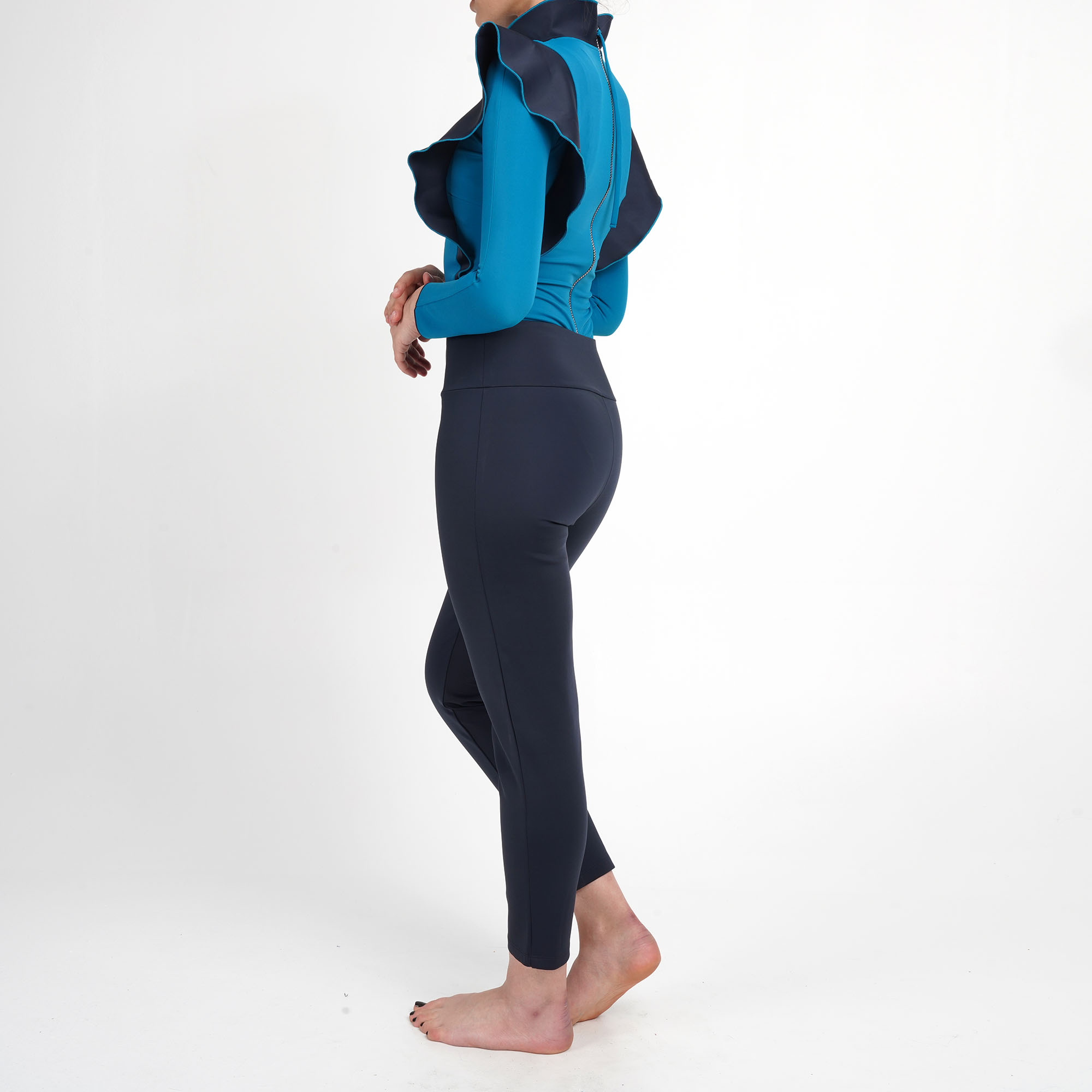 Our Sanibel long-sleeve swimsuit is the definition of taking things to the next level! A surf suit with a flamboyant, elegant twist! A Long gunmetal zipper runs the length of the back, leading up to a form-holding Neoprene tulip collar in a contrasting colour! Complimented in the front with a set of matching ruffles in Neoprene. This model will stand out on any beach anywhere in the world.
